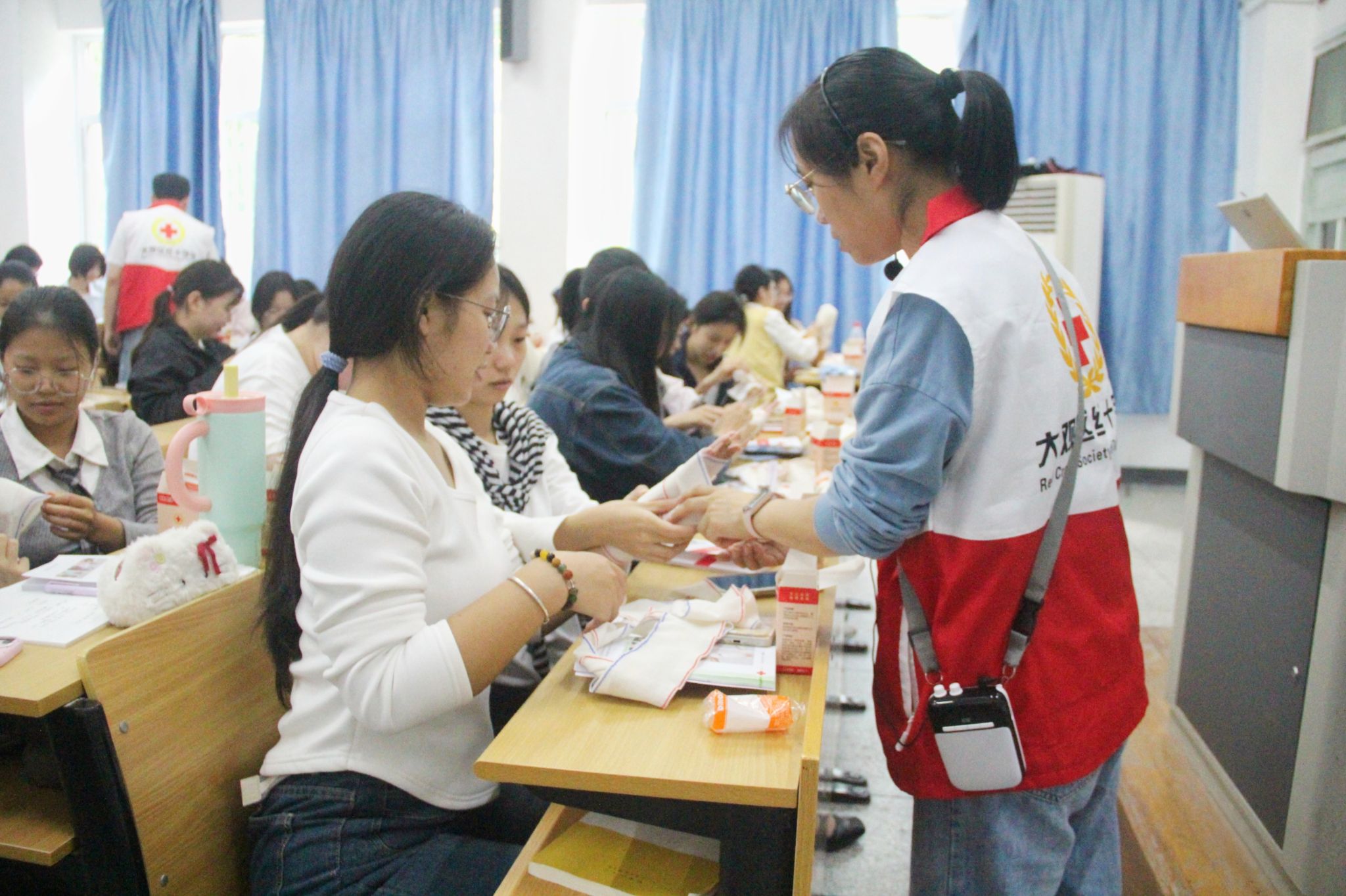 培训内容聚焦救护新概念、心肺复苏、创伤现场救护、意外伤害处置及常见急症现场救护五大板块,工作人员通过模拟真实急救场景,将理论知识与实操要点紧密结合,系统讲解急救基本原则与不同伤情的包扎技巧。