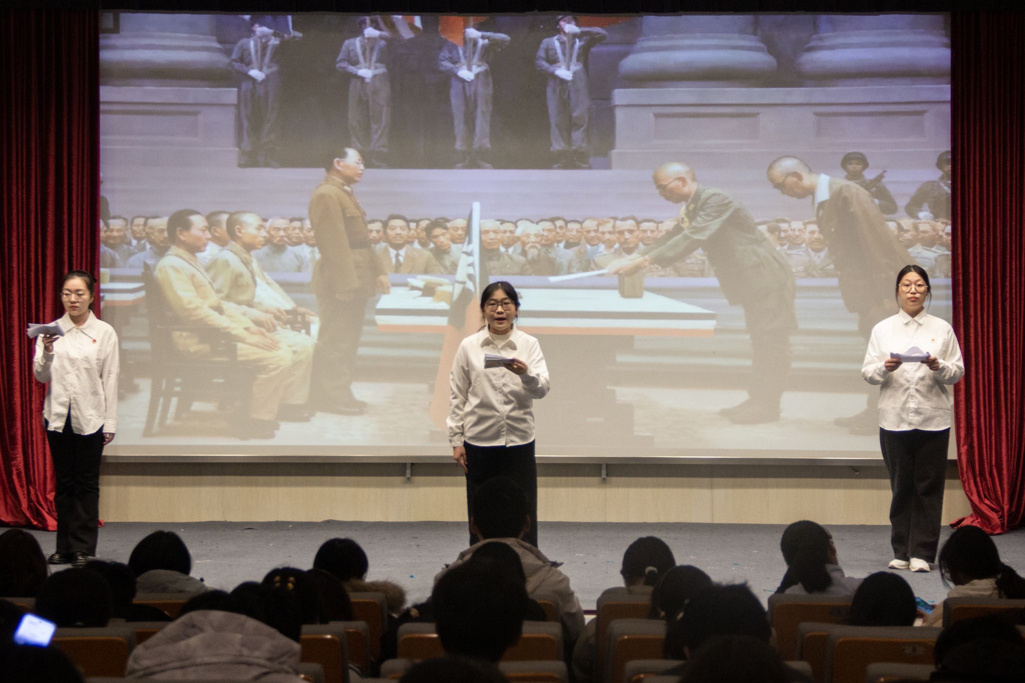 《乌斯浑河的记忆》则以“八女投江”的革命故事为蓝本,通过艺术化改编,诠释了烽火岁月中女性革命者宁死不屈的民族气节。“看着孩子们背着书包笑着上学,我们就知道当年的选择没有错”这句满含期许的台词响起,两位宣讲员并肩而立、目光坚定,仿佛将八位女战士视死如归、携手投江的壮烈场景重现眼前。现场学子纷纷挺直脊背,眼神中满是崇敬与动容,深切感受到革命先辈为和平付出的沉重代价。