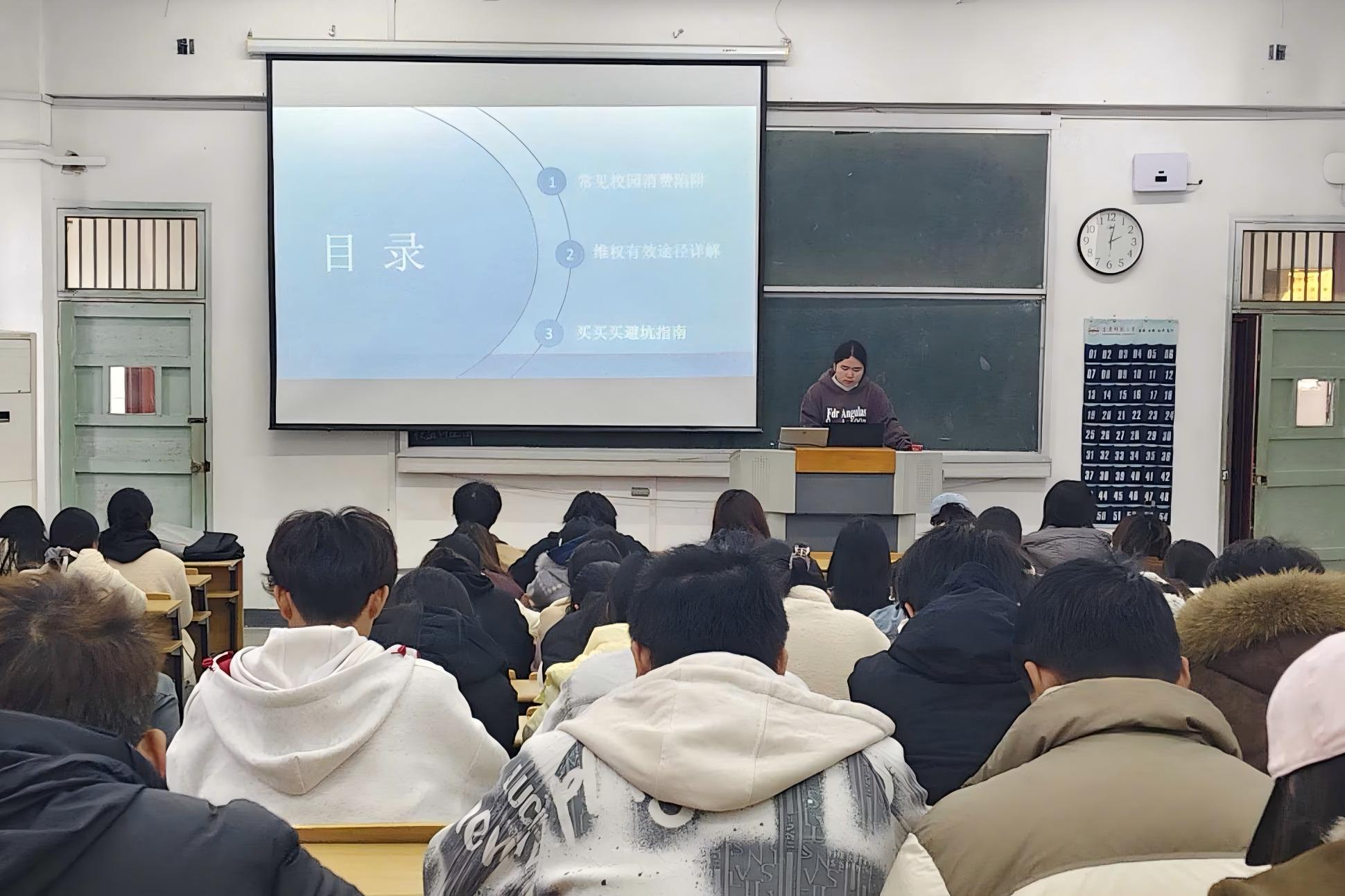 讲座围绕常见校园消费陷阱、维权途径、消费指南,用真实案例介绍了青年学子身边常见的消费陷阱,梳理了保留消费凭证、与商家协商、向平台投诉、拨打12315热线等维权步骤,明确了大员工维权的合法途径与注意事项。