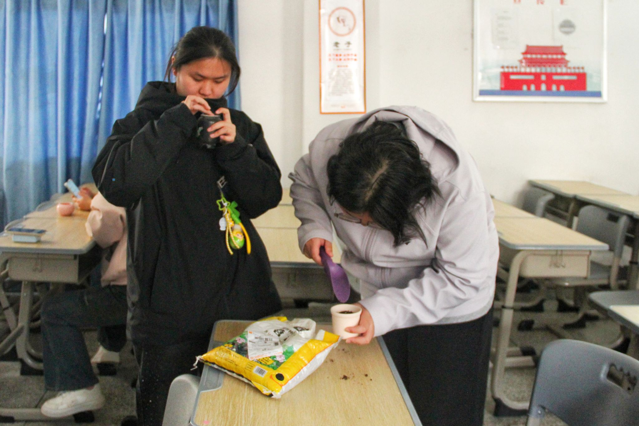 聆听讲解、观摩示范后,大家纷纷化身“园艺师”动手实践,同学们自发分组、默契协作,从挑选花盆、装填土壤,到挖坑播种、覆土压实,每一步都专注细致,动作从生疏逐渐变得娴熟。过程中大家相互交流栽种技巧,耐心调整细节,在亲手播种、悉心打理的过程中,真切感受劳动的充实与生命萌发的蓬勃力量。