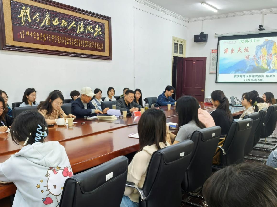 郑炎贵老师以“源出天柱,皖文化漫谈”为题分享自己数十年的天柱山研究心得。他从安徽省文化宣传中“皖”字日益凸显的文化地位切入,指出从“徽风皖韵”到“皖美中国年”“皖美徽味”等品牌形象的演变,皖文化正迎来繁荣发展的新机遇。郑老师围绕所著的《仰止天柱》与《皖耕集》,系统梳理了皖文化的根柢、文脉与特质,以翔实的考据与生动的讲述,带领师生穿越千年,领略皖文化“源头性、开合性、断续性、不平衡性”的独特气质。他特别强调,天柱山作为“皖山”,安庆作为“皖山皖水所在地”,在安徽地域文化中扮演着“皖源”的核心角色,呼吁在座的青年学子“参与皖文化研究,推陈出新,创造新的辉煌”。