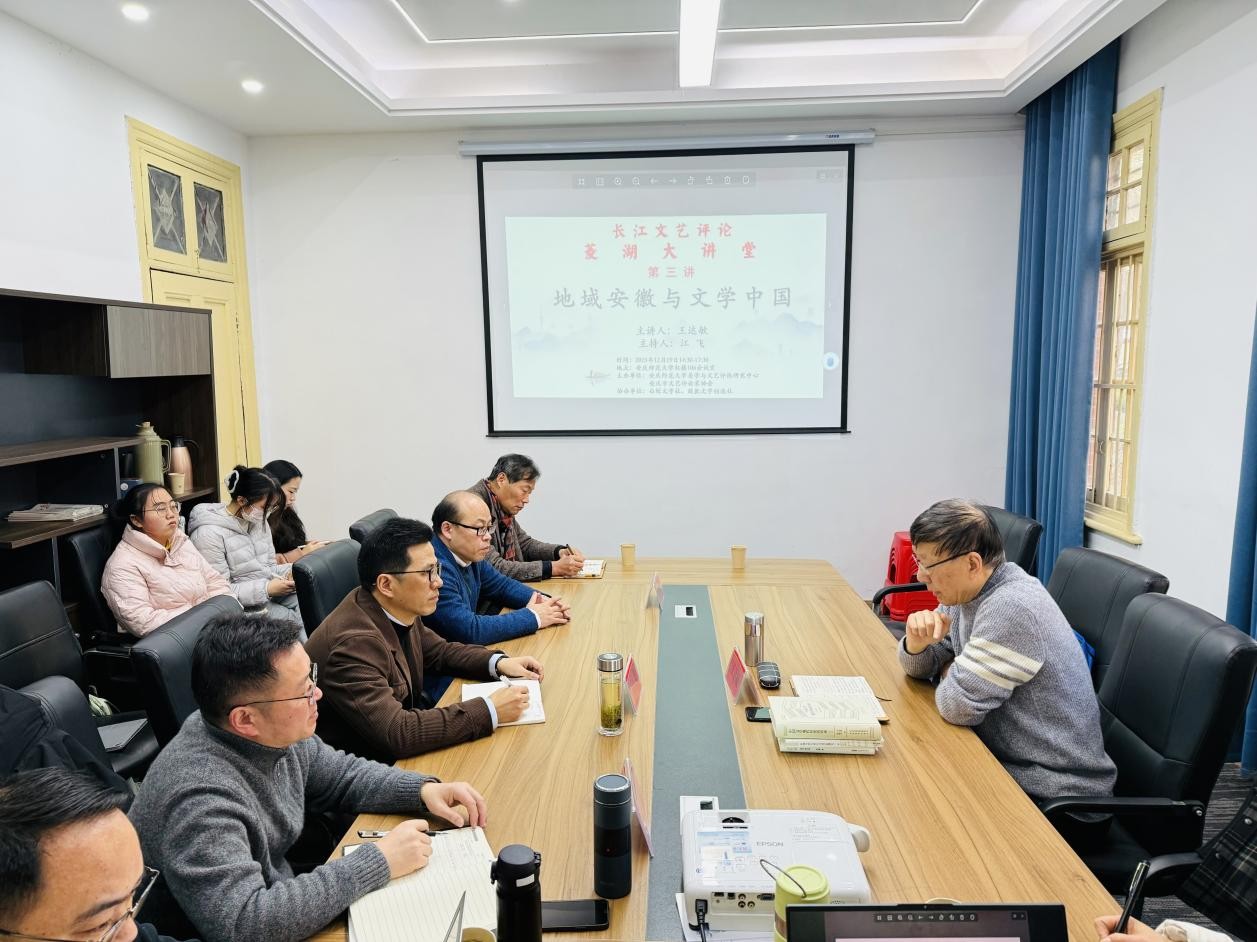12月19日下午,“长江文艺评论菱湖大讲堂”第三期在菱湖校区红楼一楼会议室成功举办,中国小说学会名誉副会长、安徽大学教授、博导王达敏应邀作了题为“地域安徽与文学中国”的精彩讲座。本次讲座由安徽省文艺评论家协会主席、伟德国际1946源自英国美学与文艺评论研究中心主任江飞教授主持,来自中国现当代文学和文艺学专业的部分老师和研究生近20人参与此次活动。